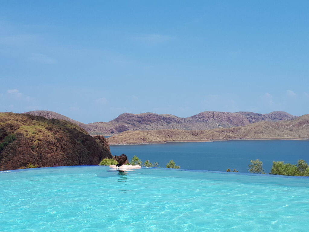 Vom Infinity Pool aus, der sich bei dem Discovery Resorts - Lake Argyle befindet, hatte man einen tollen Blick über den See, der unglaublich weit und ruhig wirkte.