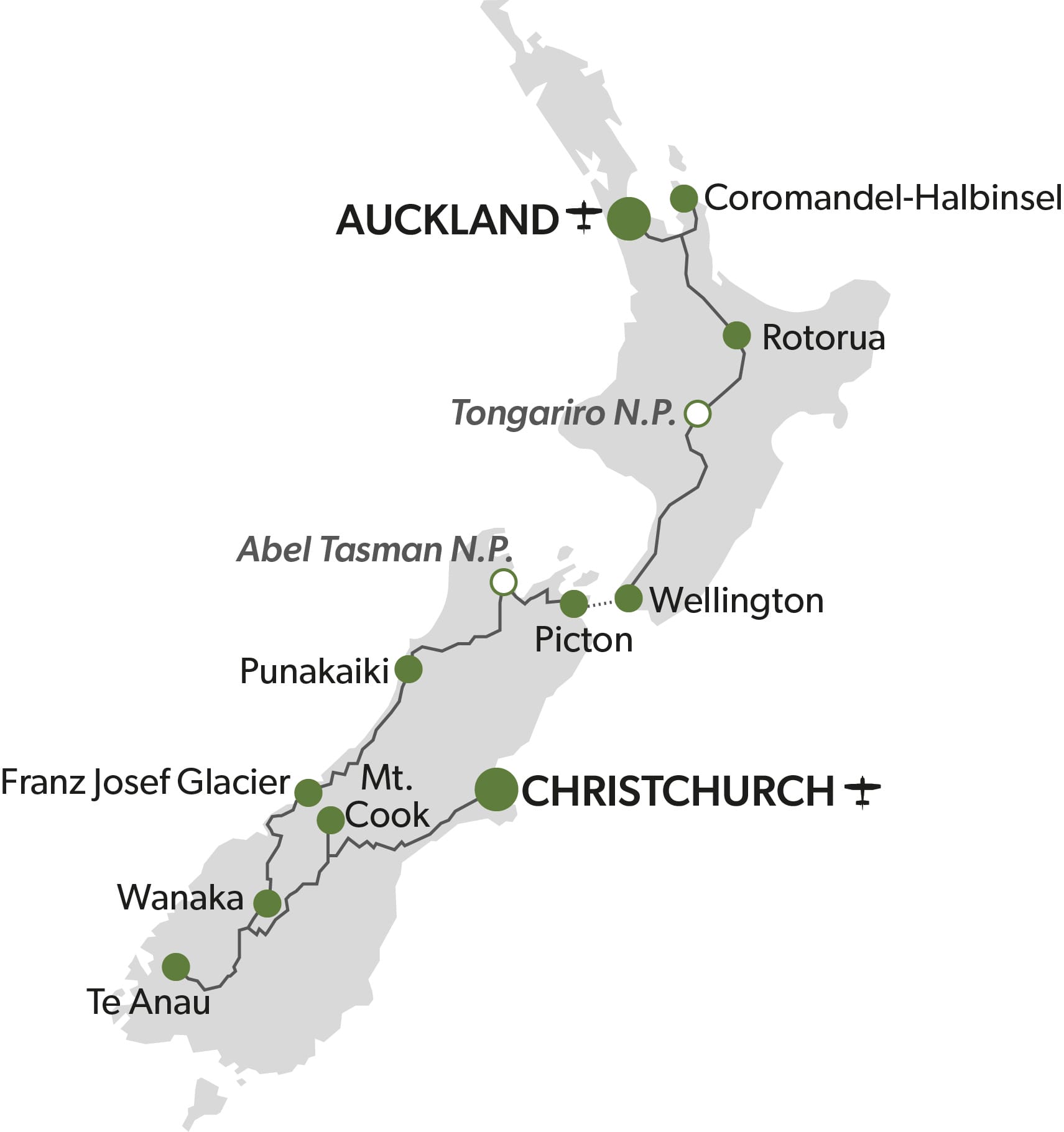 Neuseeland ist ein Traumziel für alle Naturliebhaber. Die atemberaubende Vielfalt von verschiedenen Landschaftsformen wie Gletscher, Fjorde, alpine Berge, weites Weideland, traumhafte Küstenstreifen, pittoreske Städtchen, Regenwälder mit gigantischen Bäumen oder auch schroffe Täler, Flusslandschaften mit Wasserfällen werden auch Sie verzücken. Und wie lässt sich so etwas am Besten erkunden? Richtig, wenn Sie sich in genau diese Natur stürzen und sie sehen, hören und manchmal auch riechen oder schmecken können. Diese Selbstfahrerreise ist genau die richtige für Sie, wenn Sie tief und hautnah in Neuseelands Natur eintauchen möchten. Die Etappen sind so gestaltet, dass Sie in den meisten Orten mindestens zwei Nächte verweilen werden und somit Zeit haben, eben diese Regenwälder, Farmlandschaften, Küsten, Fjorde und Gletscher auf teilweise geführten Wanderungen oder auch individuell zu entdecken. Also worauf warten Sie? Schnüren Sie Ihre Wanderstiefel und los geht's!
