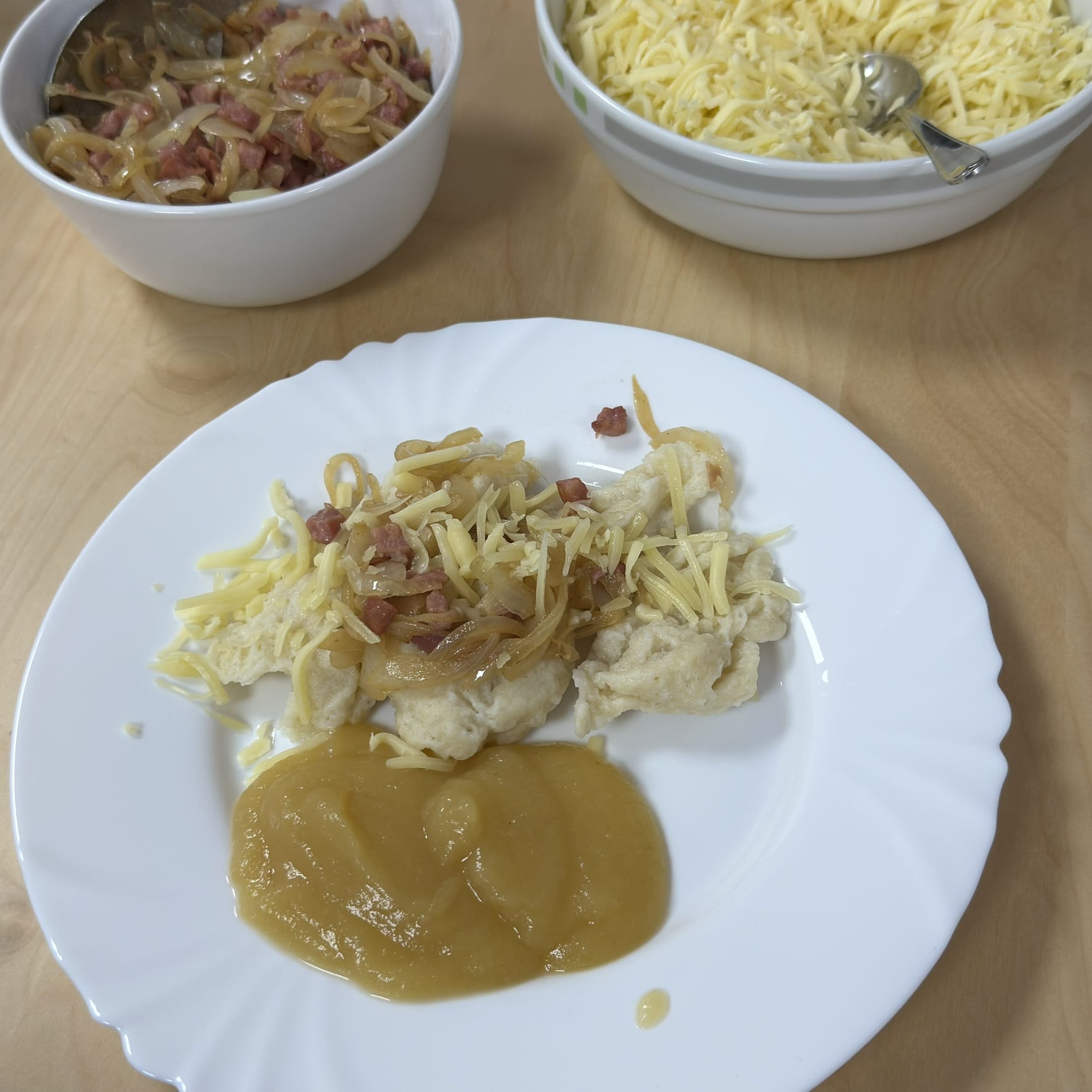 Mehlklöße wahlweise mit Speck und Zwiebeln garnieren, geriebenem Käse und Apfelmus. Für die Feinschmecker – Flüssigwürze darüber träufeln 😊